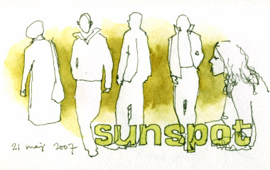 Both drawings are about 12 x 8 cm, Lamy Safari with Noodler´s Lexington Grey on a small Moleskine Watercolor page. The watercolors were added afterwards. “Sunspot” is the name of a shop in the mall, I´m am in no way connected to them, never bought anything from them, and I won´t even tell you what they sell. I just thought the sign was cool.
