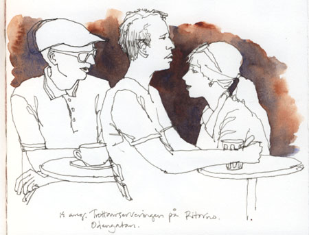 Did another café drawing as well. The guy in the cap had such an interesting face and style, I just had to draw him. I don´t particularly like drawing in cafés, though, I often feel they are too crowded. It´s easier in the summer, when many cafés and restaurants have tables outside, often with a little more space around them. Not that I mind so much if