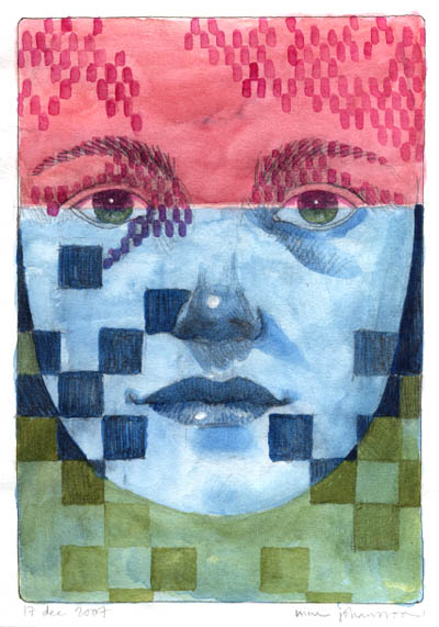 When I started this December challenge of drawing something from imagination every day, I made two 14-page sketchbooks especially for this month. This drawing is the last page of the first of those folded books. Don´t know who it is, I just drew this face as an excuse to play with patterns and colour.