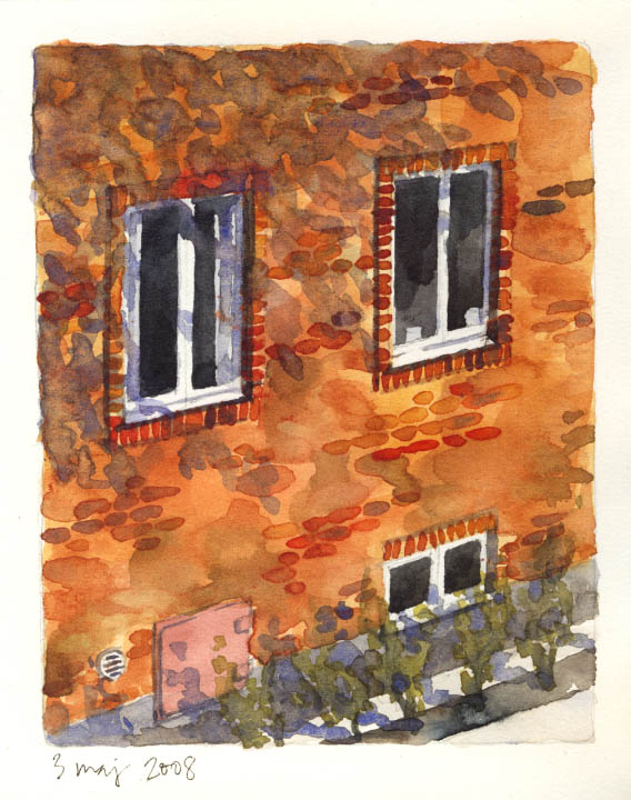 Posting a slightly older painting today. I was browsing back through my sketchbook and found this one, and discovered how much the sun has changed it´s course since the beginning of May. I can see these windows from my home, and this particular wall doesn´t have any tree shadows on it anymore, it´s in the shade almost all day now. Funny how the light changes slowly slowly over the year.